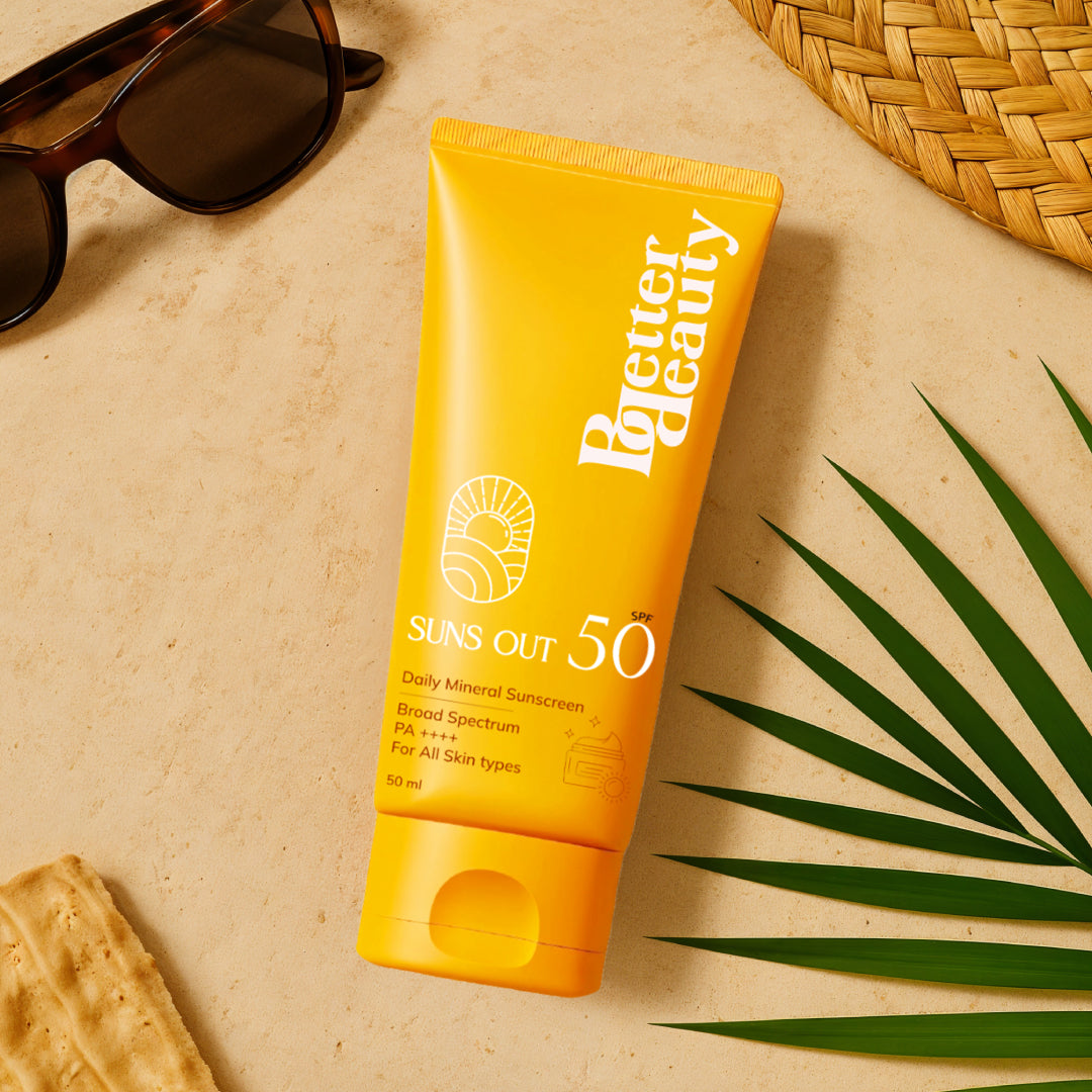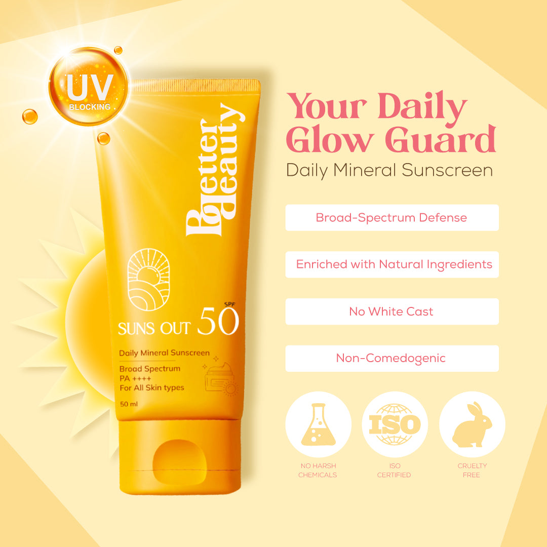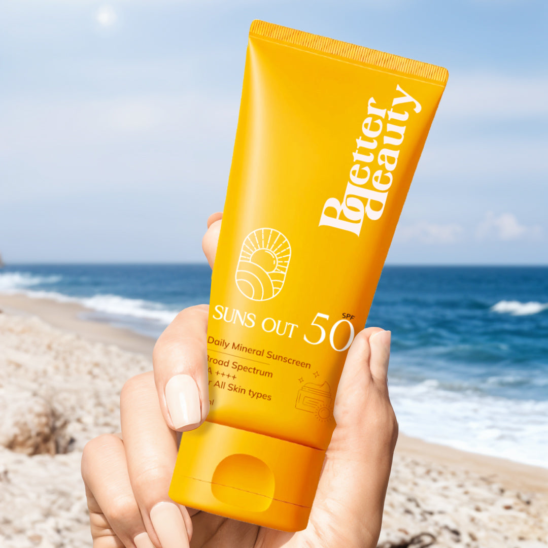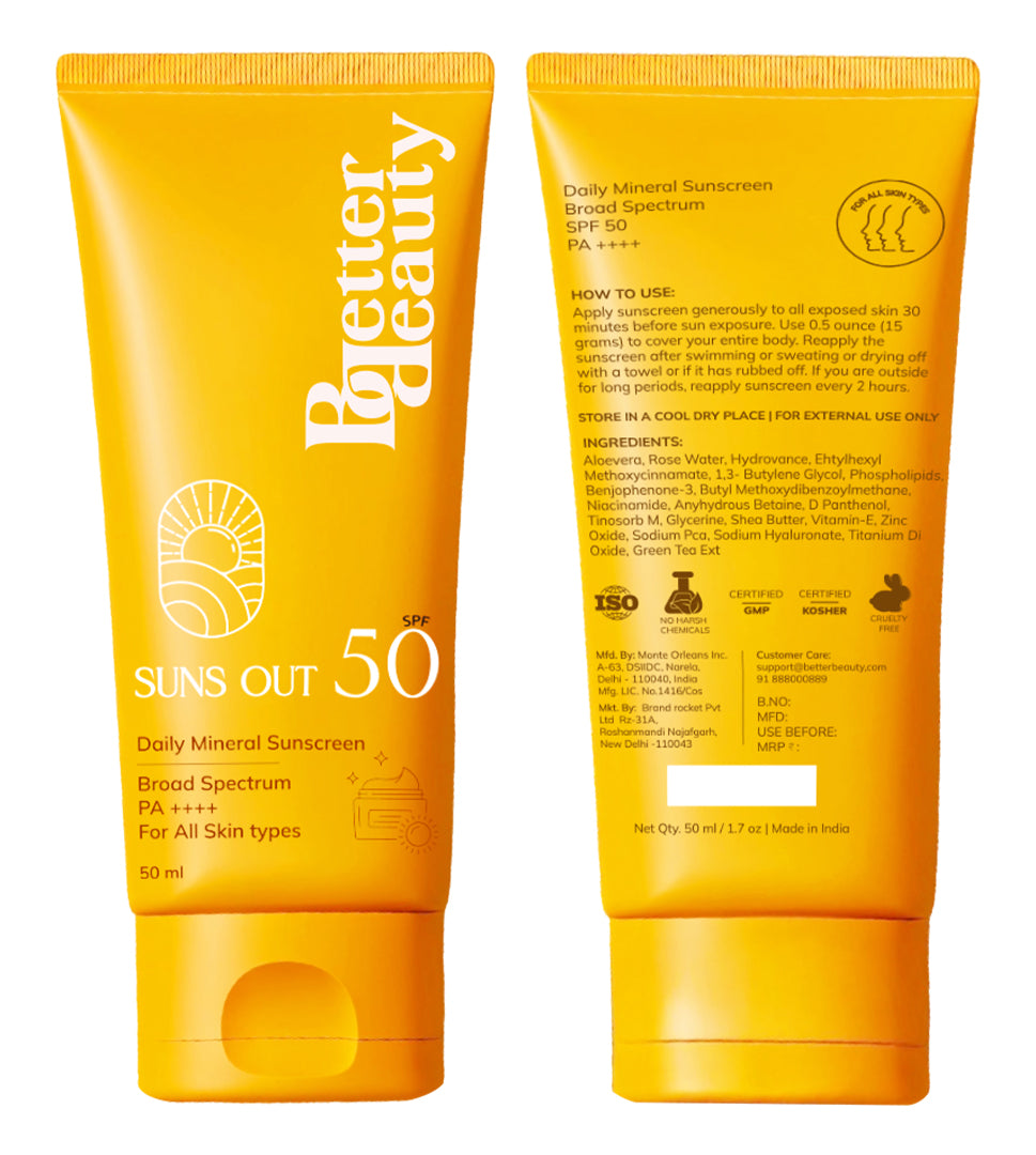 Better Beauty Suns Out SPF 50 Daily Mineral Sunscreen is a broad-spectrum, clean beauty essential designed for all skin types. With SPF 50 and PA++++, it offers strong protection against both UVA and UVB rays, while being gentle on your skin. Powered by nourishing ingredients like rose water, hyaluronic acid, green tea extract, D-Panthenol, and vitamin E, it hydrates and soothes your skin as it protects.