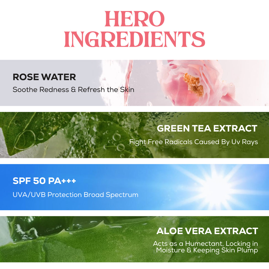 Aloevera, Rose Water, Hydrovance, Ehtylhexyl Methoxycinnamate, 1,3- Butylene Glycol, Phospholipids, Benjophenone-3, Butyl Methoxydibenzoylmethane, Niacinamide, Anyhydrous Betaine, D Panthenol, Tinosorb M, Glycerine, Shea Butter, Vitamin-E, Zinc Oxide, Sodium Pca, Sodium Hyaluronate, Titanium Di Oxide, Green Tea Ext